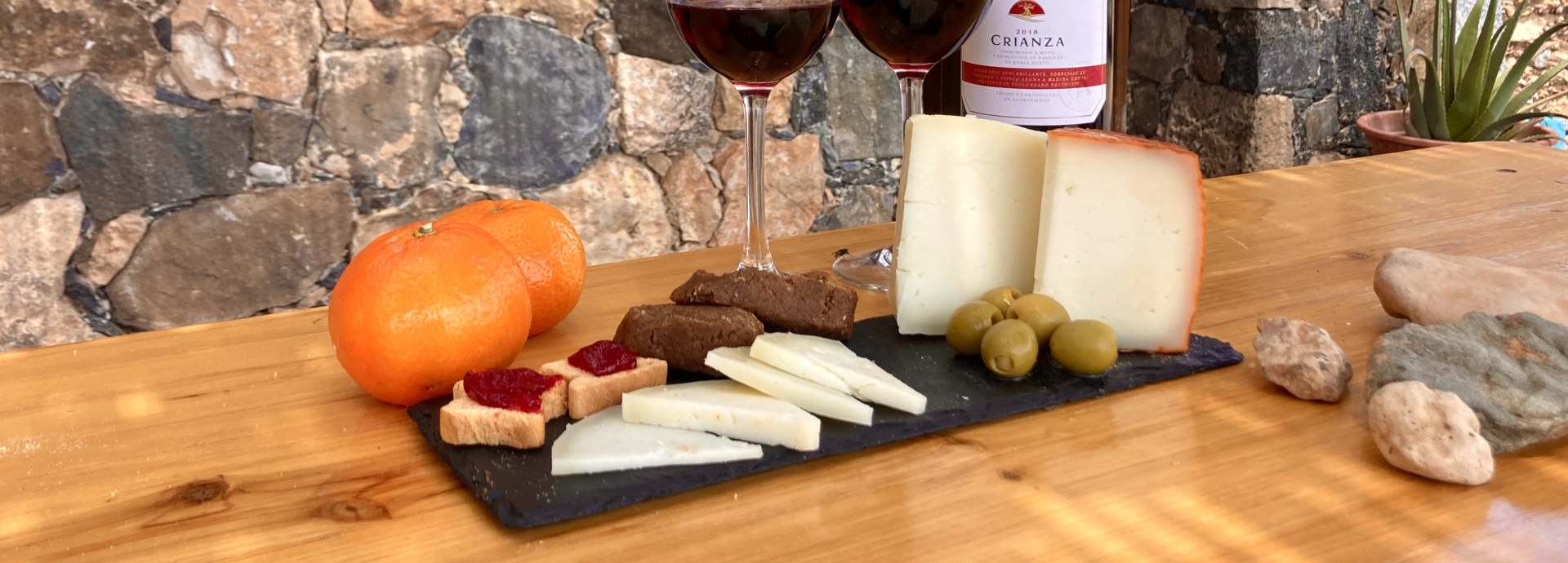 Nach dem Spaziergang mit den Tieren wird ein kleines Picknick auf einer Terrasse angeboten. Der Ziegenkäse ist typisch für Fuerteventura. Für die Kinder gibt es Saft, Obst, Ziegenkäse und die hausgemachte Pella de Gofio. Die Eltern genießen den köstlichen Käse mit einem guten Glas Rotwein.