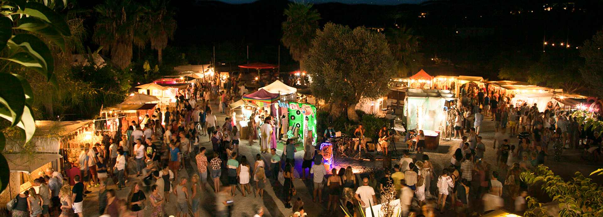 Erleben Sie einen unvergesslichen Abend auf dem berühmten Hippie-Markt Las Dalias, einem der bekanntesten und farbenfrohesten Märkte Ibizas.