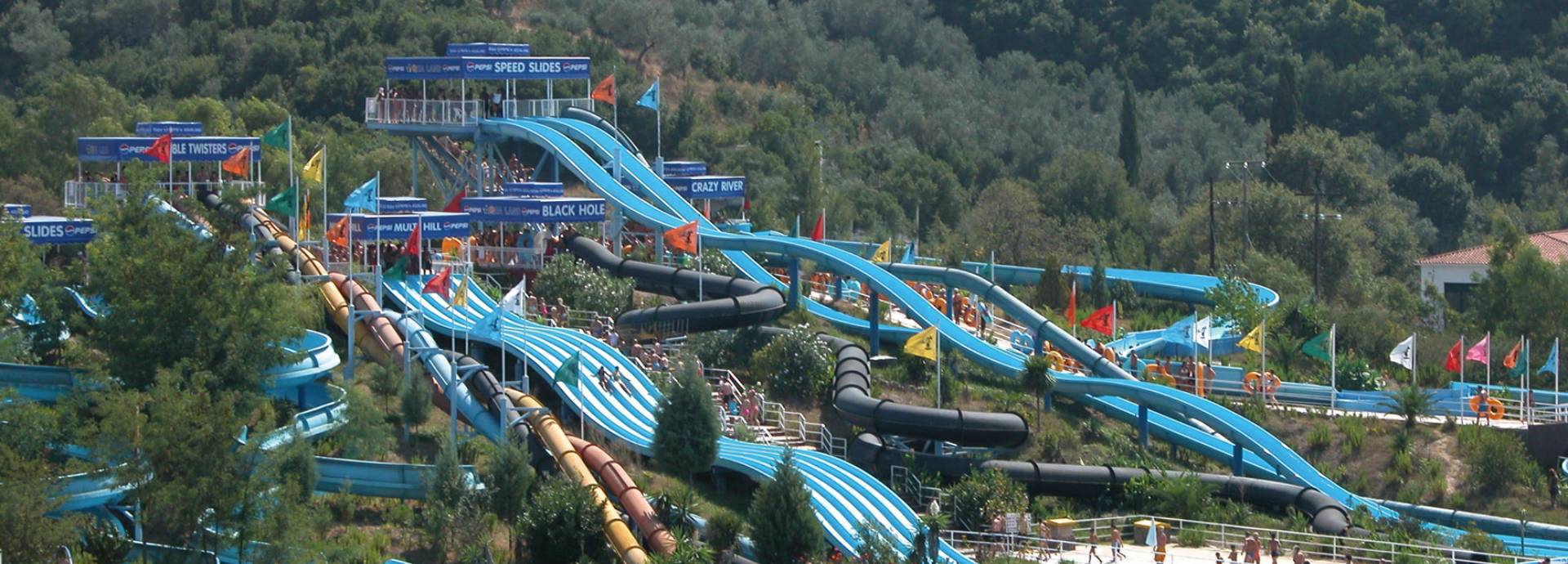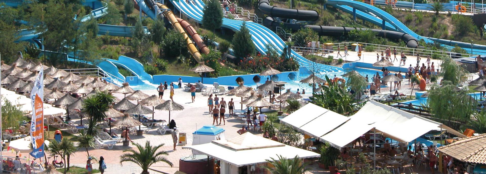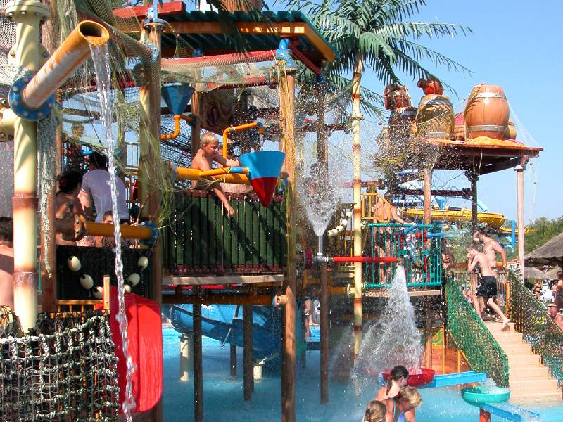 Zahlreiche Rutschen – wie Kamikazes, Four Twisters und Black Hole – sowie Erlebnispools und Kinderattraktionen wie Hüpfburg und Abenteuerspielplatz erwarten Sie und Ihre Kinder in dem 125.000 Quadratmeter großen Park.