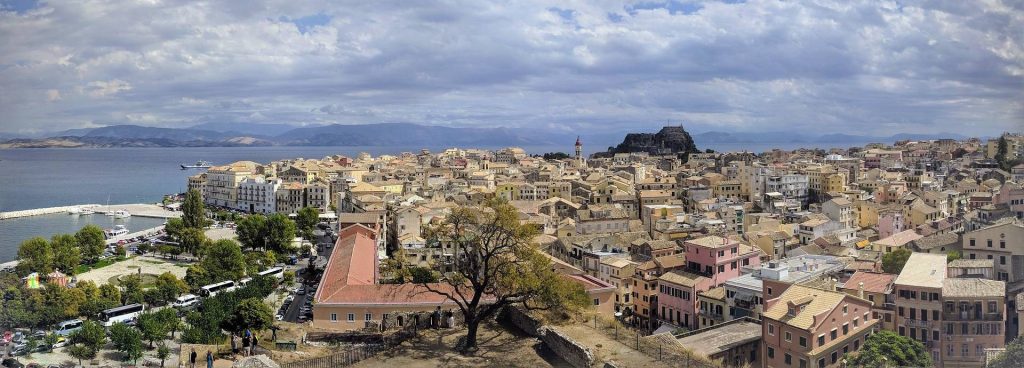 Das allgegenwärtige internationale Flair von Korfu-Stadt ist geprägt durch die geografische Lage (Italien ist näher als Athen), die Besucher aus aller Welt (ein großer Kreuzfahrthafen liegt vor der Altstadt) und die multikulturelle Geschichte der Stadt. Wenn auch nur 50 Jahre anwesend, haben die Briten mit dem königlichen Palast St. Michael und St. Georg, einem neoklassizistischen Bauwerk am nördlichen Ende der Esplanade, aber vor allem mit dem Cricket-Platz, bleibende Eindrücke hinterlassen. Den größten architektonischen Einfluss hatten jedoch die Venezianer: Zeugnisse ihres Wirkens sind die Alte Festung aus dem 16. Jahrhundert (Paleo Frourio), die Neue Festung (Neo Frourio) und das prächtige Rathaus (1691 als Loge der Adligen gebaut; ab dem frühen 18. Jahrhundert bis 1903 als Theater genutzt).