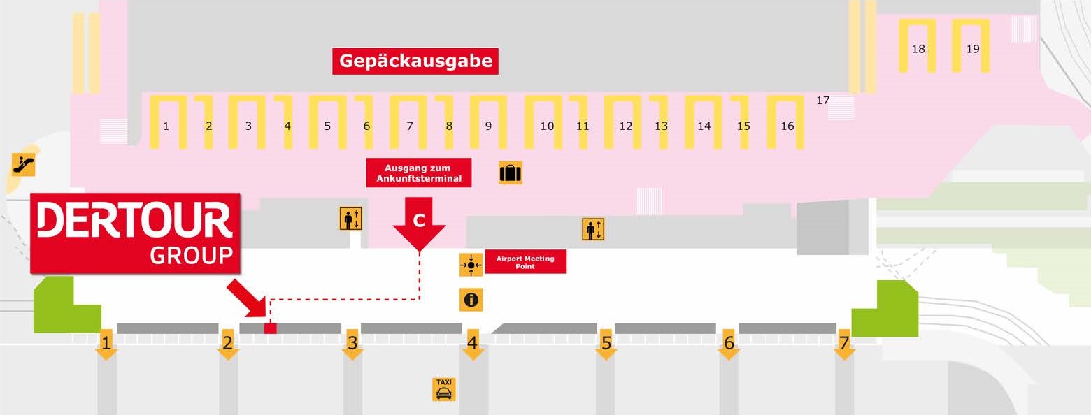 Bei Ihrer Ankunft am Flughafen Palma de Mallorca verlassen Sie den Gepäckbereich in die Ankunftshalle. Bitte begeben Sie sich nach rechts zu unserem DERTOUR Group Schalter ca. 60m entfernt. Hier werden Sie von unserer Reiseleitung empfangen und erhalten weitere Informationen zu Ihrem gebuchten Transfer.